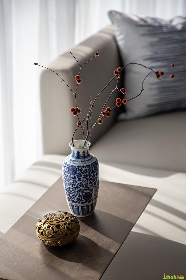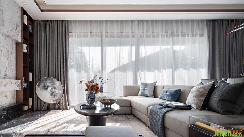 客廳細(xì)節(jié)丨溫潤(rùn)的墨色、清透的紗簾、飽滿的陽光,樣板房設(shè)計(jì)空間氣質(zhì)在強(qiáng)烈與雅致間自由切換,新與舊在這里自然融合而不相斥,呈現(xiàn)出空間與物體共處的和諧美感。