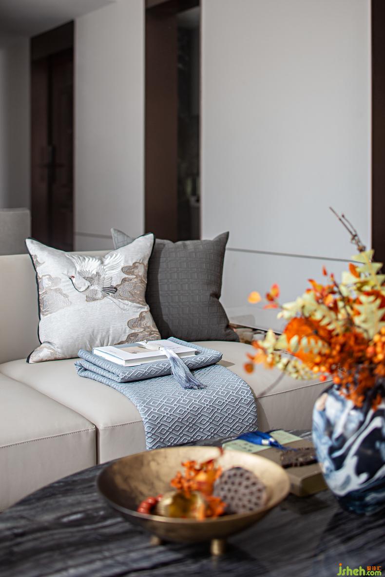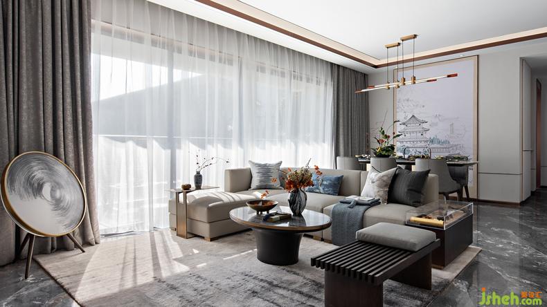 客廳丨將傳統(tǒng)文化意境中的遠(yuǎn)山淡影、恬淡安舒、虛懷澄明,樣板房設(shè)計(jì)以藝術(shù)設(shè)計(jì)的方式實(shí)現(xiàn)出來,人文精神浸潤(rùn)空間內(nèi)外,追躡時(shí)光的足跡更顯意味悠長(zhǎng)。