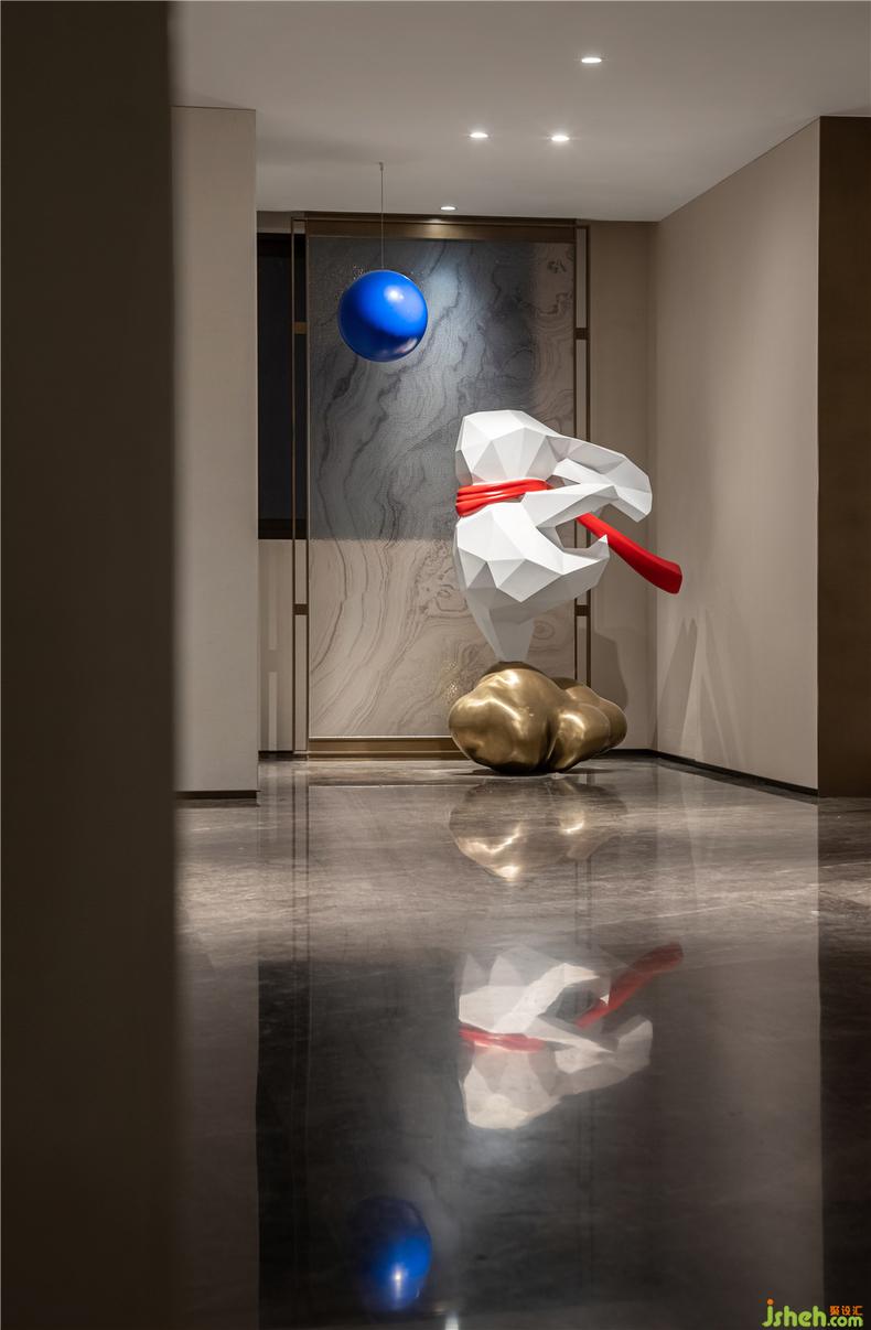 走廊一隅丨雕塑《追》丨腳踏云彩追尋夢想,向往未來(藍球),再顏色上圍合主題調(diào)色:紅藍、金屬材質(zhì)的云更符合整理空間氣質(zhì)。