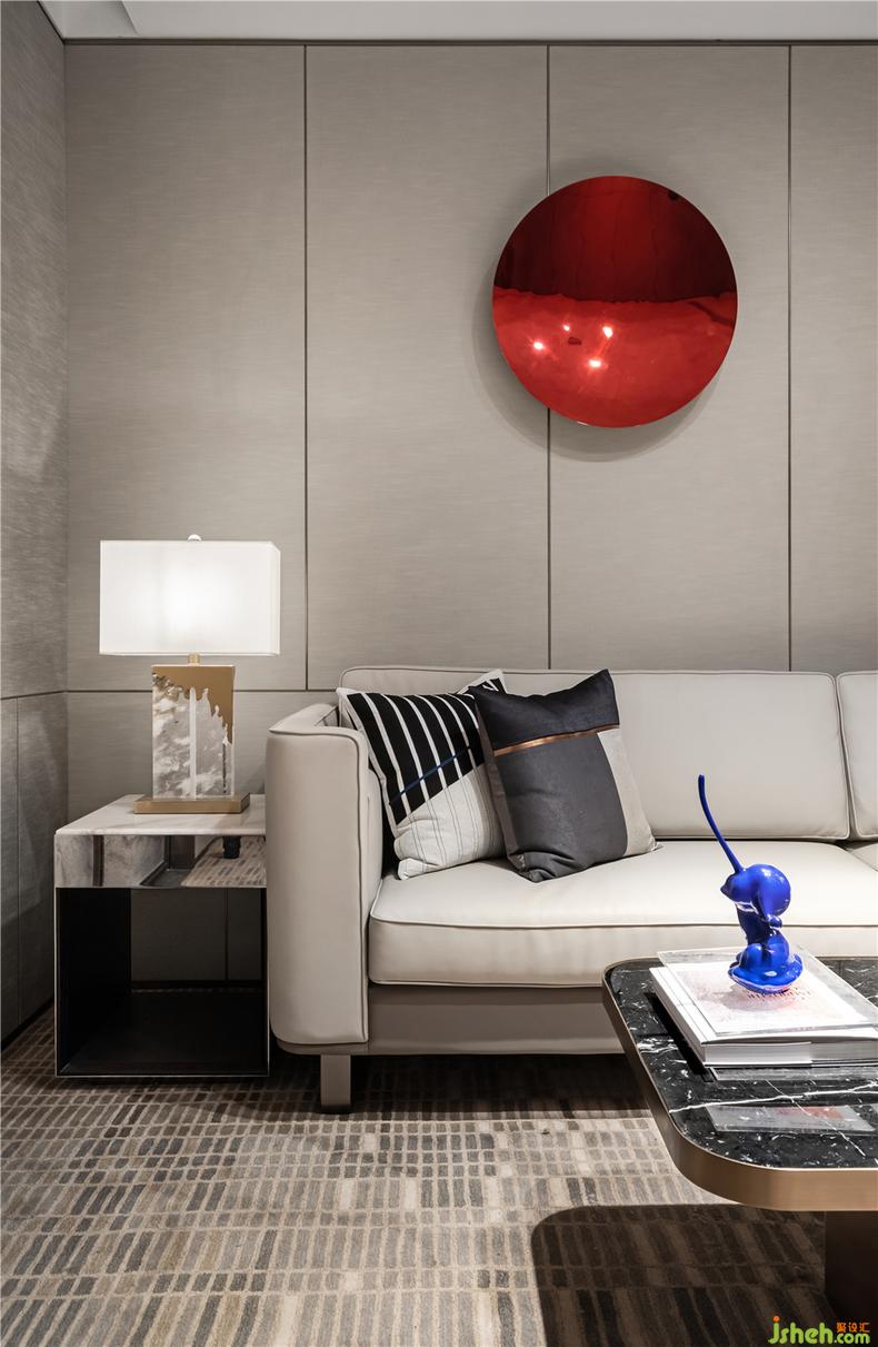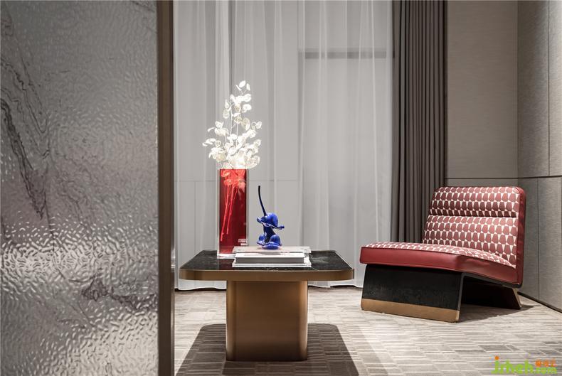 簽約室 丨紅藍的碰撞在原本沉穩(wěn)華美的空間里跳躍,金屬與燈光的映照提供一個使人沉浸和愉悅的氛圍,售樓處裝修設(shè)計使得我們的眼睛和所有的感官被誘醒,去形成一個從進入開始的完整的體驗感。