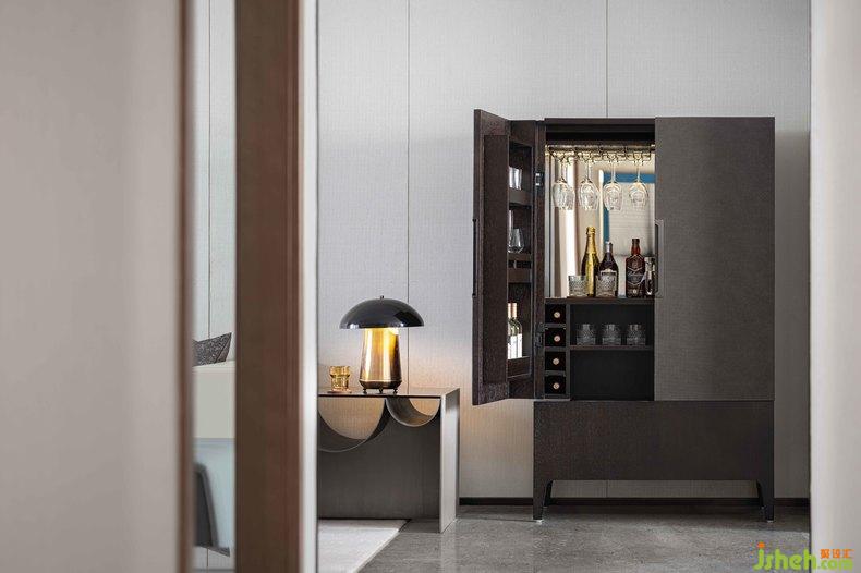 客廳細節(jié)丨金色與奢橘呼應(yīng),日光下熠熠生輝,增添精致生活質(zhì)感。室內(nèi)設(shè)計師從臥室看向客廳,酒柜平直的線條、精湛的工藝將經(jīng)典與沉穩(wěn)的氣質(zhì)展現(xiàn)出來,低調(diào)的融入品質(zhì)生活的情趣。