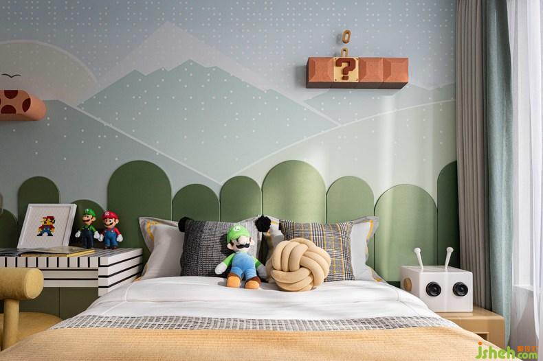 兒童房丨小朋友喜愛的超級(jí)馬里奧主題的空間,森林的綠意充滿著清新之感,利用游戲元素改造成儲(chǔ)物格及玩具,趣味與功能兼容,童趣盎然。