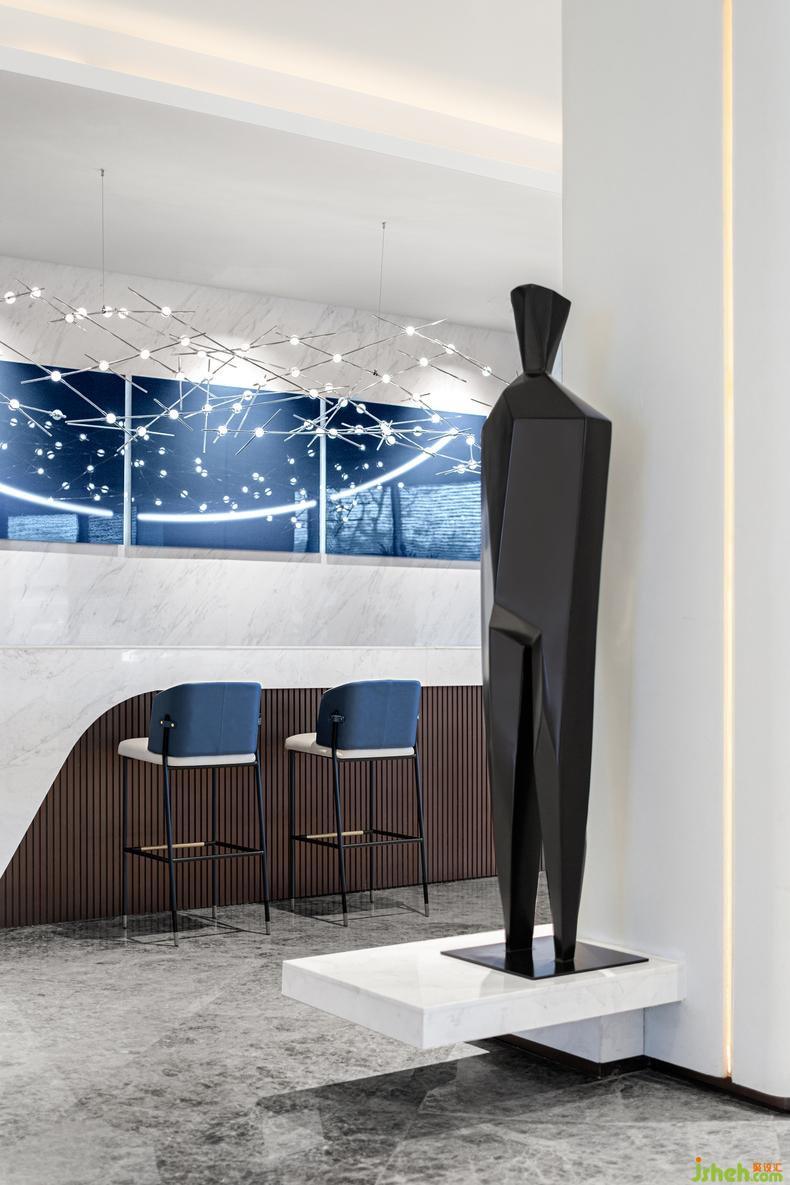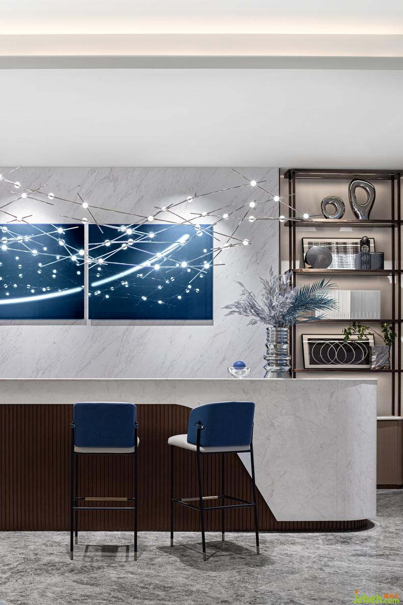 水吧區(qū)丨 重組和煥新式空間敘事梳理流線的關(guān)鍵,室內(nèi)設(shè)計(jì)師水吧空間的剛?cè)嵬瑯?gòu)讓視野更加聚合,明快的浩瀚藍(lán)勾描著未來的體驗(yàn)感,豐富交織的縱貫頂燈,彼此疊置融合,串聯(lián)交互,更衍生出序列的體驗(yàn)感,讓寰宇滲透進(jìn)可塑的空間體量中。