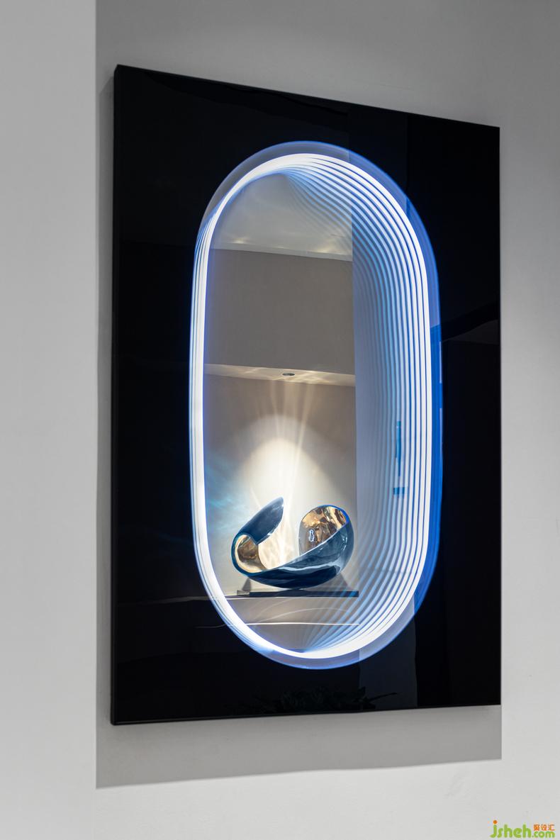 裝置丨 如聲波、如星跡的自然起源與再現(xiàn)的的形態(tài)裝置,如同能量的嵌入,室內(nèi)設(shè)計(jì)師將未來的動(dòng)態(tài)體驗(yàn)滲透在視覺軌跡之中,用光影的結(jié)合構(gòu)建光速的快與慢、溫柔和動(dòng)感,穿透它的視野,更如一副直擊心靈的作品,演繹著科幻世界的“光與空間”。