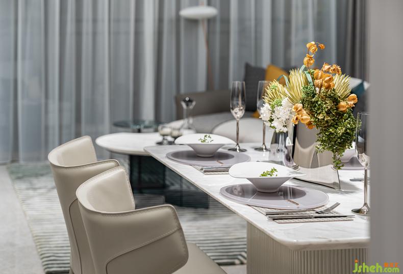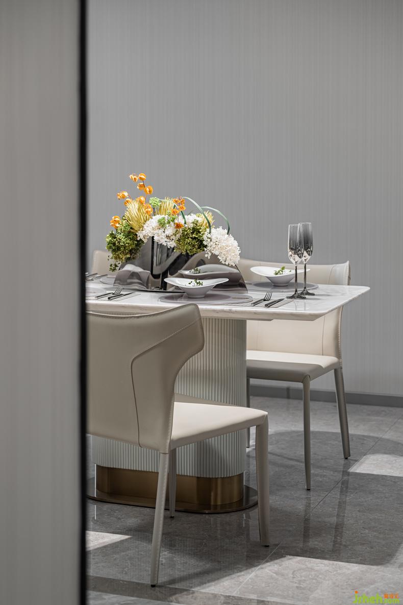 方正的餐桌、圓背的餐椅,方與圓的結(jié)合是時尚與設(shè)計的融合,柔和的米調(diào)色彩,靜物的光感溝通,讓餐廳處處流露著雅致的氣息,大理石桌面倒映著燭光,給用餐的心情增添了一份文藝。