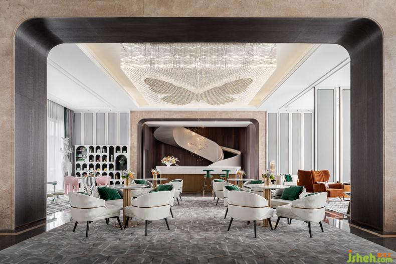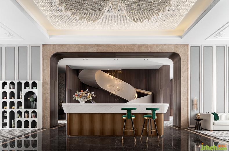 水吧區(qū)丨 呼應著中廳與洽談區(qū)的秩序基調,室內設計師線面的結合讓質感細膩通透,抬眼望去蝴蝶形態(tài)的水晶吊讓人恍若步入不同時空的漣漪,讓空間和感官都被代入了再次溝通自然的意識流里,即使移動在不同的角度里都會擁有讓人著迷的視界。