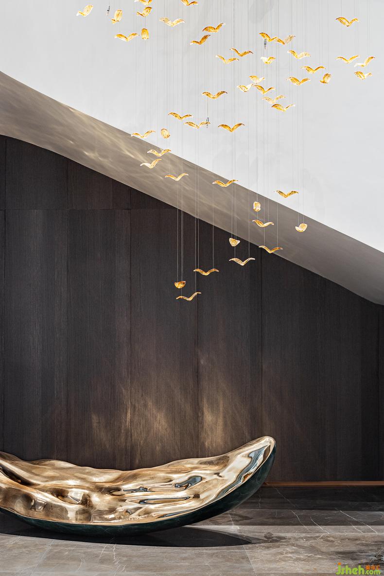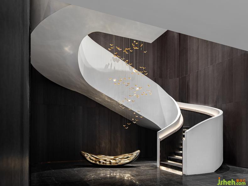 樓梯中廳丨 流暢的曲線勾勒時空的轉換,垂落而下的鎏金飛鳥為自然的韻味中增加了奢雅的靈感,金屬色調的坐歇布景,讓空間幻化出光的璀璨,美的夢境。