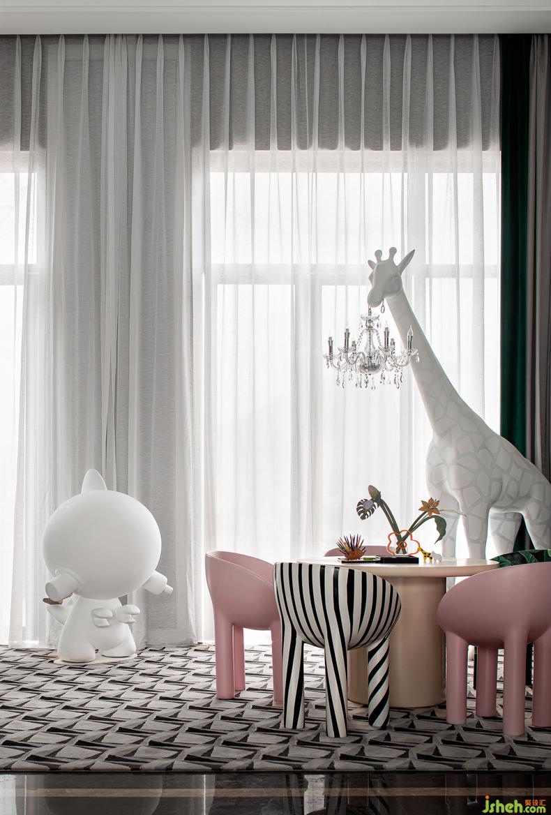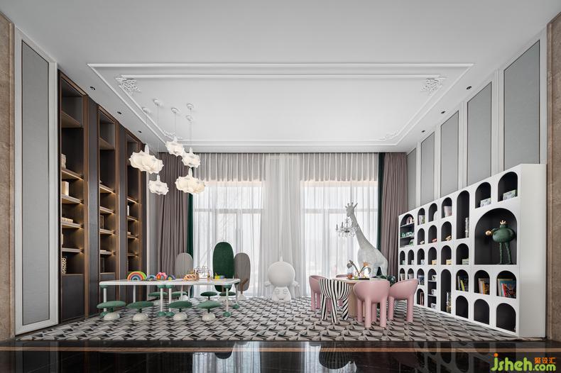 如果說凡爾賽風格最具特色的所在是什么,那莫過于隨處可見的「弧拱」在風格上的應用,兒童樂園的打造選用了這一亮眼的格局,將柔和的色調和滿鋪的圖形兼容,搭配動物的模型,童趣的擺件,為孩子呈現(xiàn)了一個暢游在異國風情的玩樂空間。