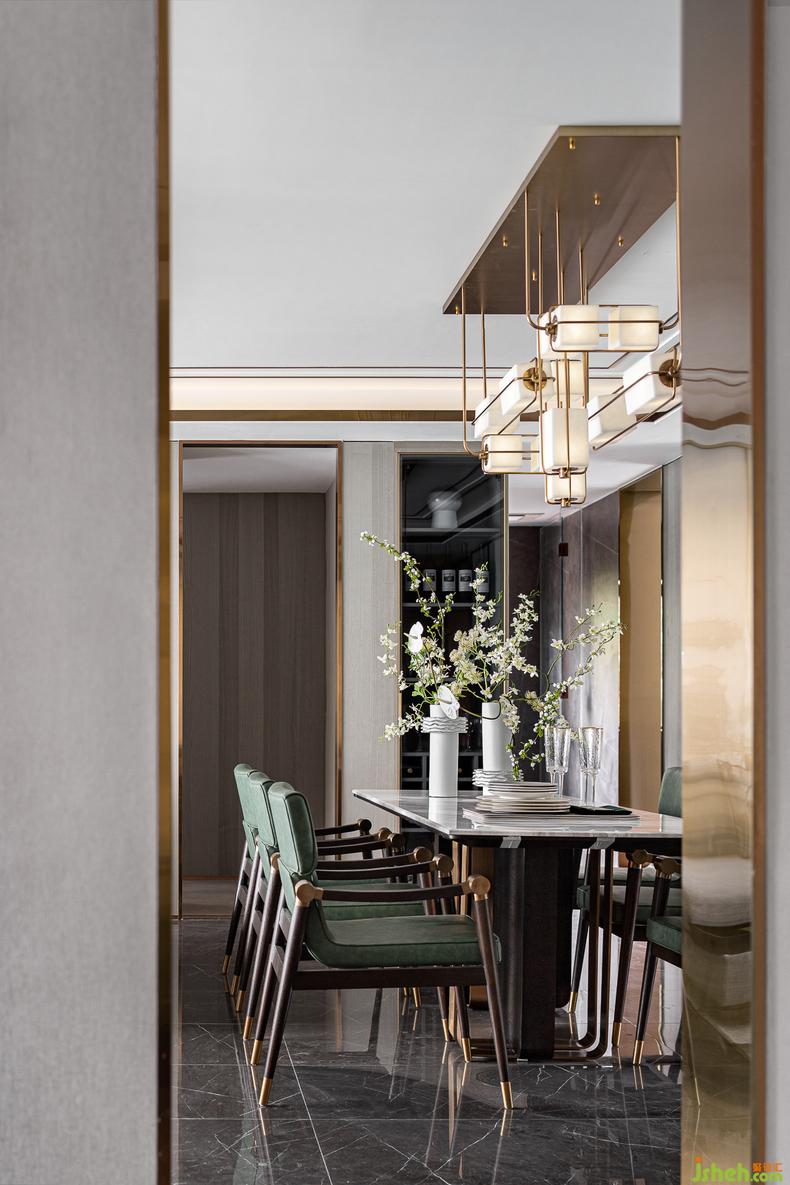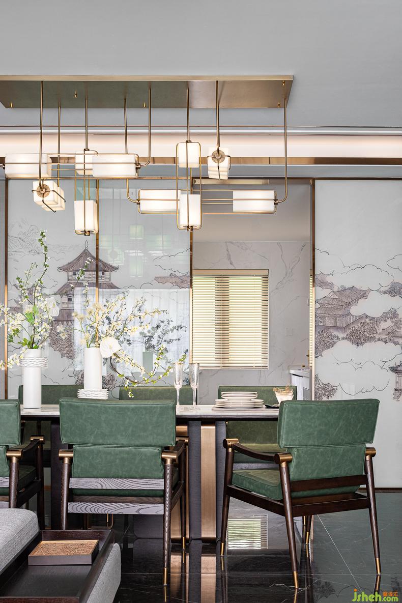 “隔而不斷”是東方古典建筑哲學(xué)中值得深究的學(xué)問,室內(nèi)設(shè)計師把餐與廚的空間關(guān)系通過一扇鋪陳著古韻的門廊架構(gòu)展現(xiàn)出來,充滿盛意的墨綠餐椅搭配著怡然雅致的創(chuàng)意燈具,即使是簡單的靜物花枝,也都是設(shè)計者為主人打造的移步異景的感官盛宴。