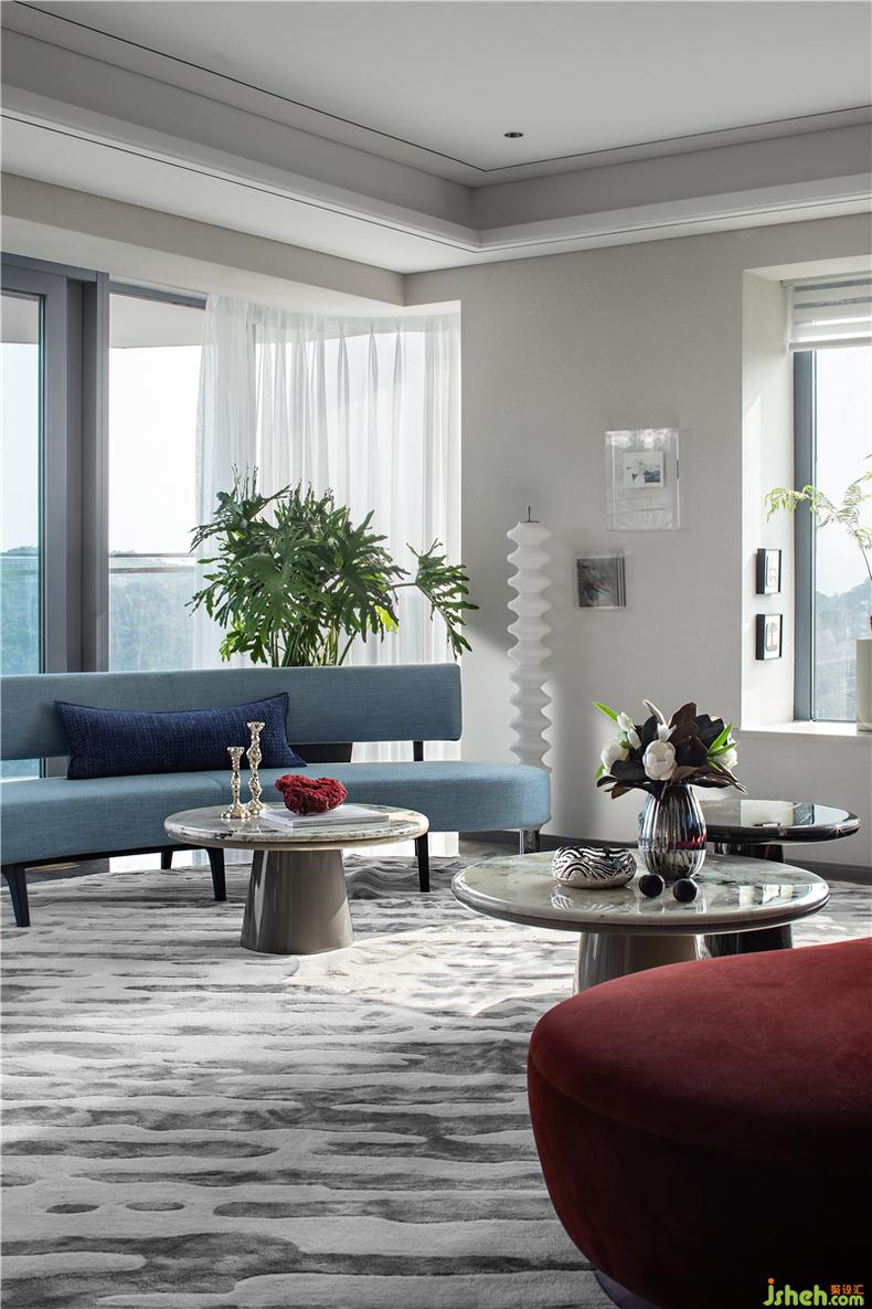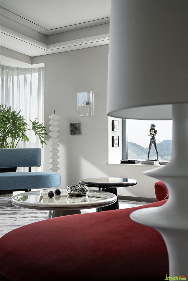 熱烈的紅,淺海的藍,桌幾的雅,配飾的藝,在雙敞的空間布局疊加了創(chuàng)意的寫意,搭配著光影的暖調(diào),線條的唯美,地毯的肌紋,綠植的舒展,如同在海灣度假一般,無不譜寫著海景大宅的閑適與時光的漫游。