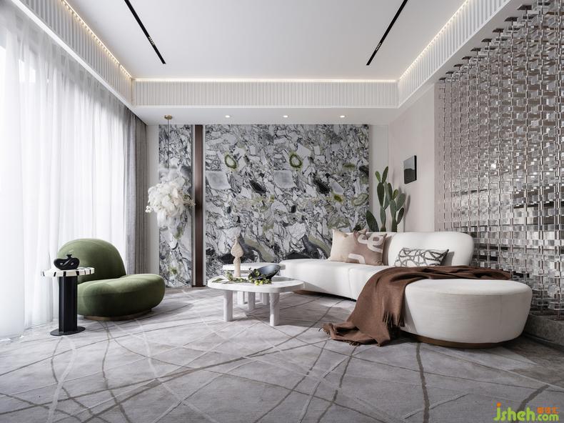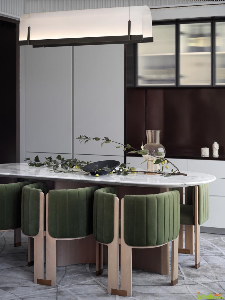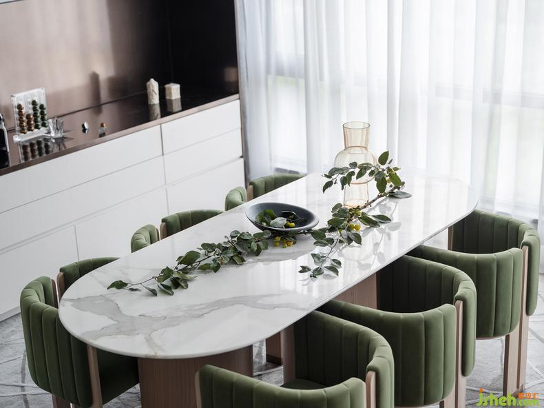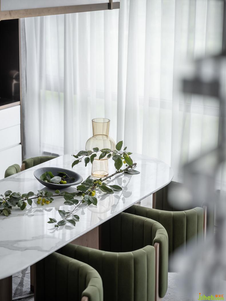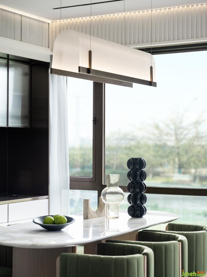 餐廳的布局方正且通透,墨綠與浮白的色彩配比從客廳延續(xù)開來,樣板房設計營造出視覺沖擊,石材與木質(zhì)的餐景裝飾呼應著落地光影映射下的蔥郁綠植,將自然融入空間,讓時光藏著愜意。