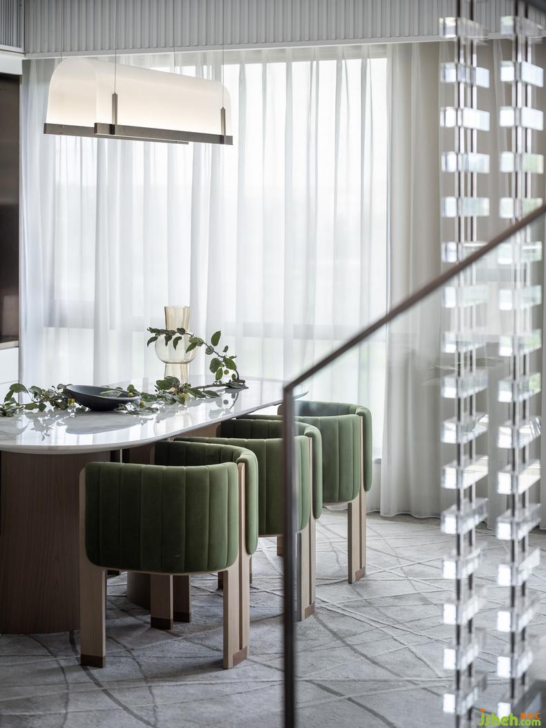 餐椅面料運用正如花草果實的關(guān)系一般,營造春意盎然的藝術(shù)美感,樣板房設計桌面上綠的白的都像生長出來的果實一樣,我們一口吃下陽光,一口吃下時光。