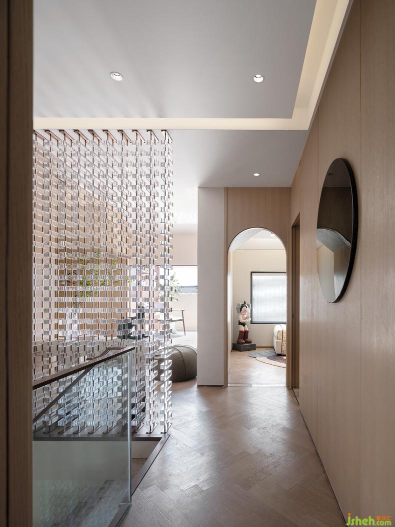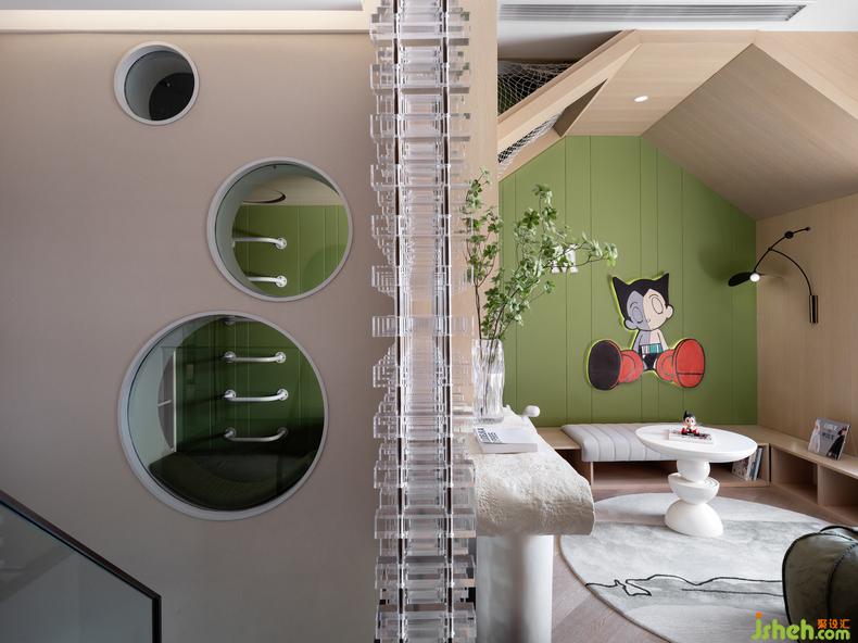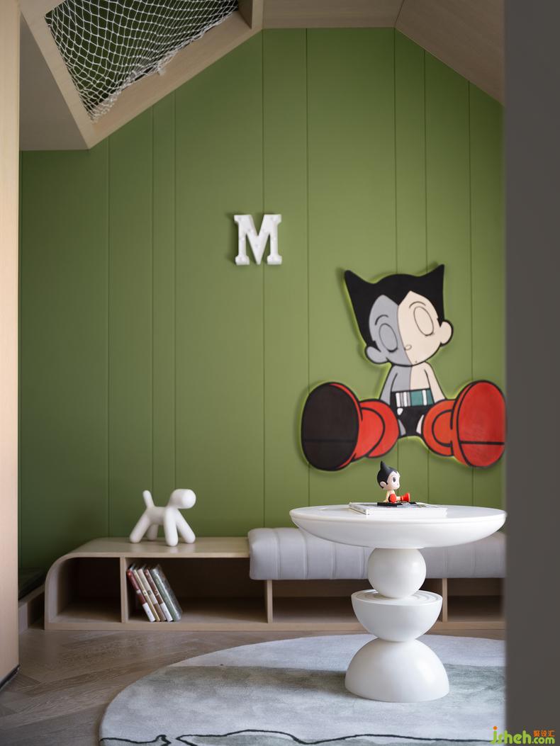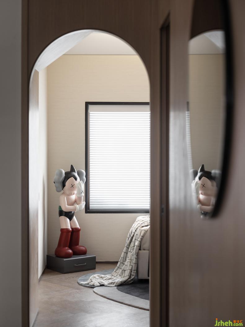 空間轉(zhuǎn)換至兒童房丨廊道的空間轉(zhuǎn)換在拱門的優(yōu)雅弧度之下,樣板房設(shè)計(jì)呼應(yīng)著和諧的韻律更不乏了幾分俏皮,當(dāng)視角延伸至盡頭的一隅,阿童木的模型印入眼簾,讓人們對(duì)空間充滿童趣的遐想和探索的動(dòng)力。