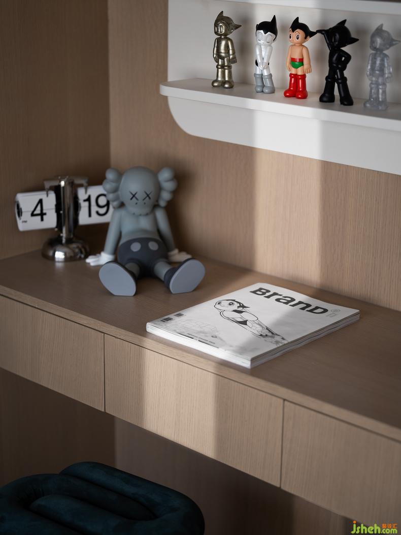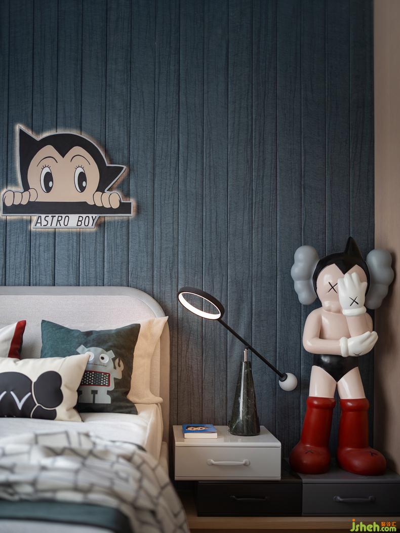 兒童房延續(xù)簡(jiǎn)約的設(shè)計(jì)氛圍,樣板房設(shè)計(jì)通過太空灰色調(diào)與阿童木元素的童趣搭配,多功能的書臺(tái)與置物,讓美感和趣味在這個(gè)空間里自在蔓延,給成長(zhǎng)多一分輕松與歡快。
