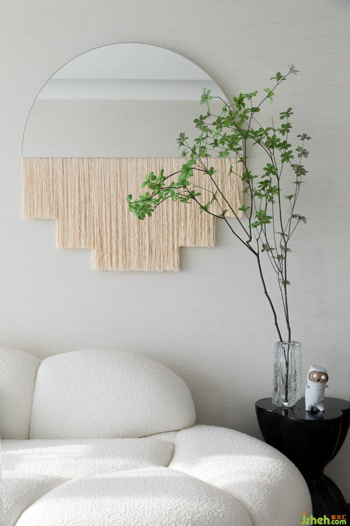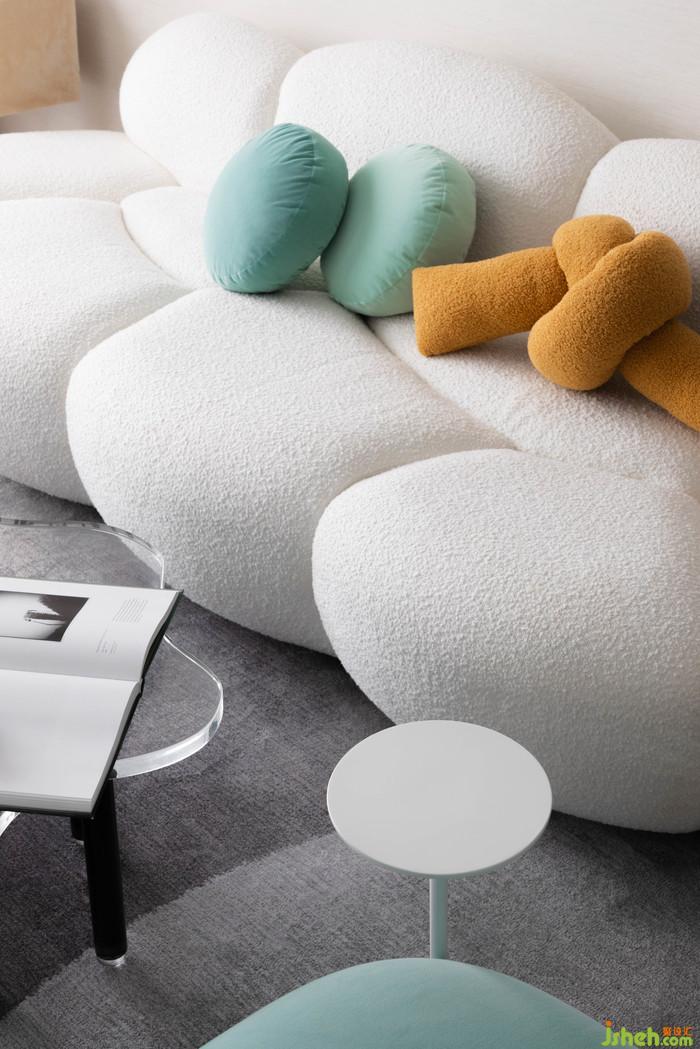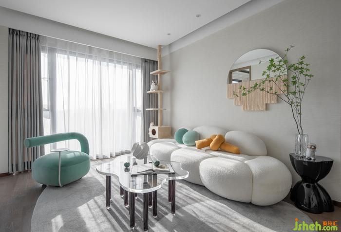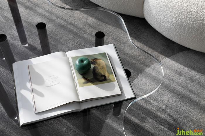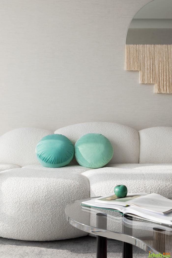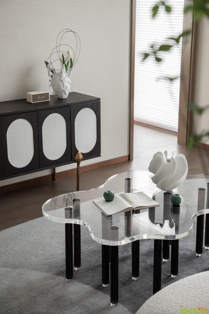客廳丨異型的毛料沙發(fā),亞克力桌幾的不規(guī)則寫意配比,通過富有動感的線性褶皺增強了半透明效果,給視野無盡的柔和與創(chuàng)意,讓客廳的互動空間充分響應了來自生活的治愈,即使漫游其中,既可以通過不同的視角,感受空間的暢意