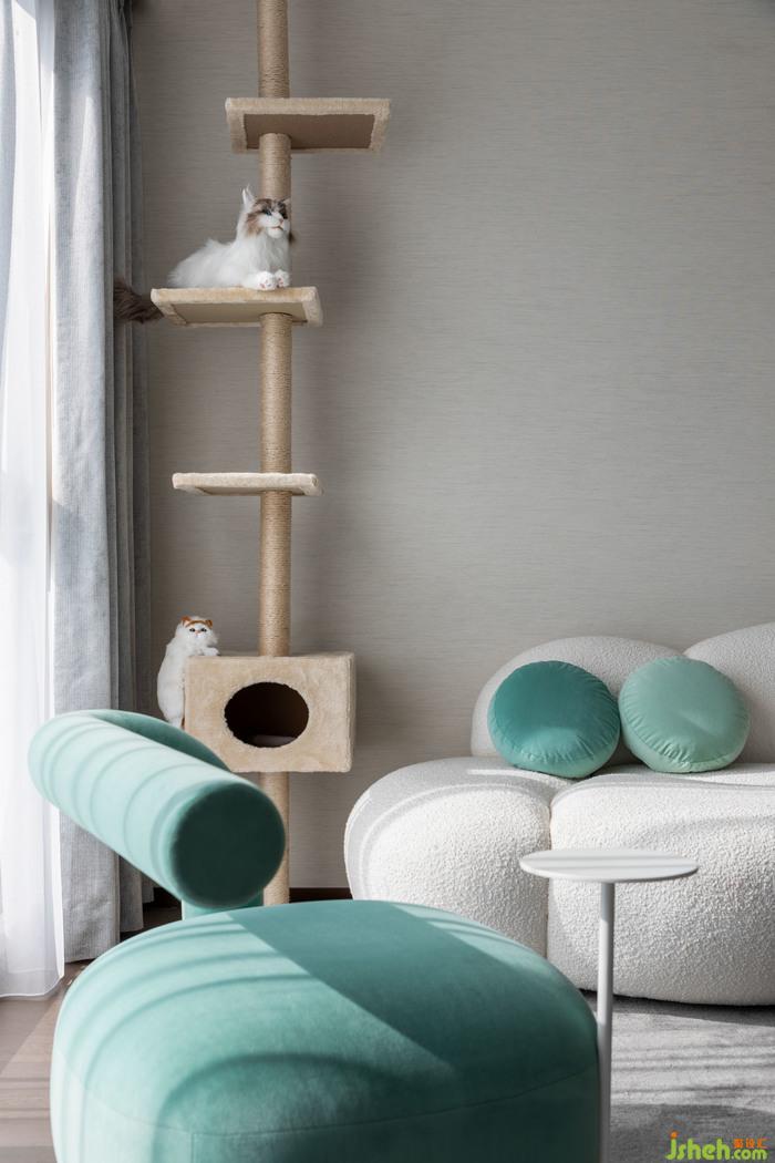 客廳丨一個屬于寵物愛好者的客廳空間,樣板房設計是柔軟且足夠生動有趣的,素雅的色調讓看似簡單的架構更添了幾分靜謐的高雅,光與影的鋪陳讓視野的角度更加多維和通透,不管是湖藍的配色還是木科植被的潤染,都讓這一處屬于主人與寵物互動的場所,充滿鮮活的靈感.