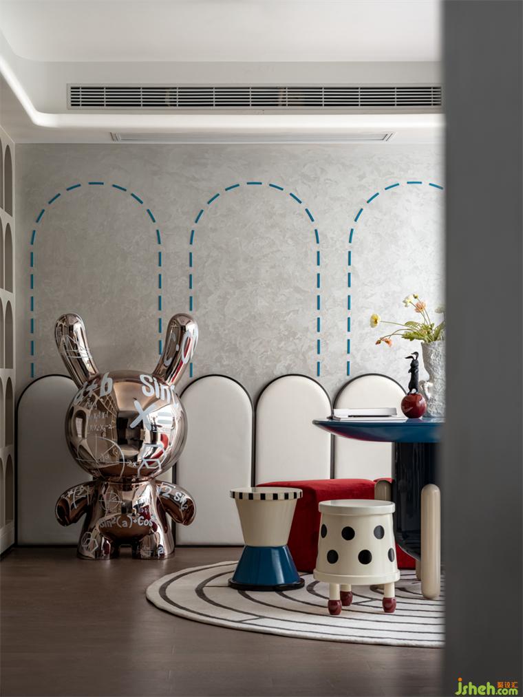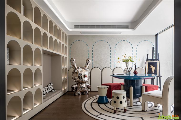 娛樂室丨這是家中孩子的舒適區(qū),撞色的‘象型家具’(以自然元素造型設(shè)計(jì)的家具)顯得更具生活感與童趣,墻邊的軟包既起到了裝飾的作用也增添了美感;整面拱形元素的柜體借喻童話的美好,樣板房設(shè)計(jì)整個(gè)空間讓孩子們可以暢玩想象。