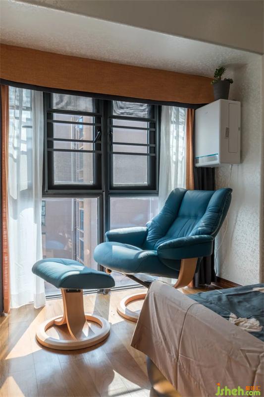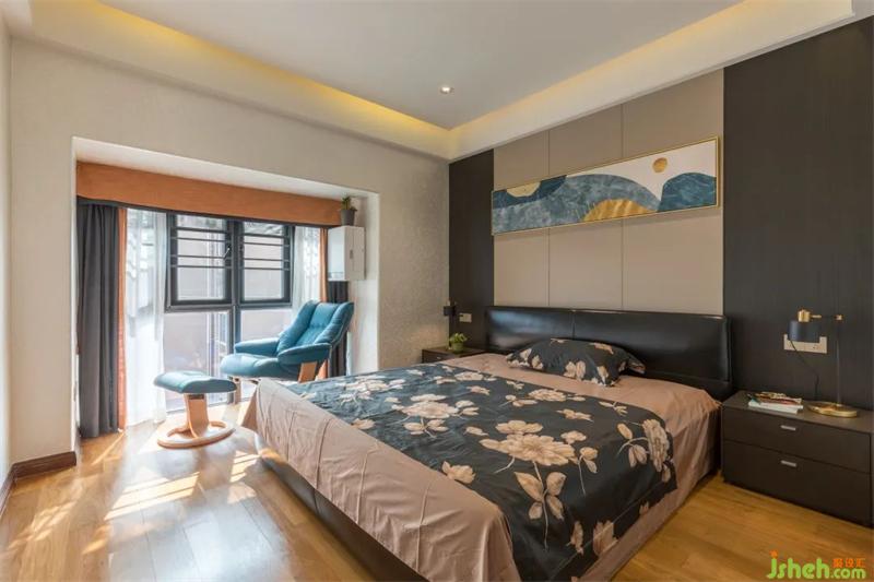 主臥的床品增添了中式的設(shè)計(jì),色調(diào)更有質(zhì)感的突顯。松花藍(lán)色的床頭背景圖,亮藍(lán)色的搖椅,靛藍(lán)色的抱枕,其中又佐以中式工筆畫(huà)的花卉圖案,提升了臥室整體的雅致格。