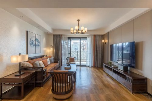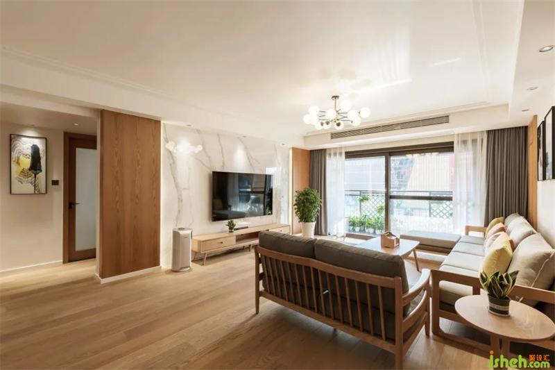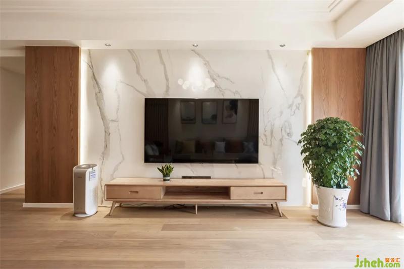 設(shè)計(jì)師一比一還原設(shè)計(jì)效果圖,整個客廳空間以木色為主,營造日式北歐感覺。大面積的落地玻璃窗,讓光線直入室內(nèi),電視背景墻處大面積留白,原木地板讓整個空間更顯干凈和自然樸實(shí),讓生活格外輕巧素雅。