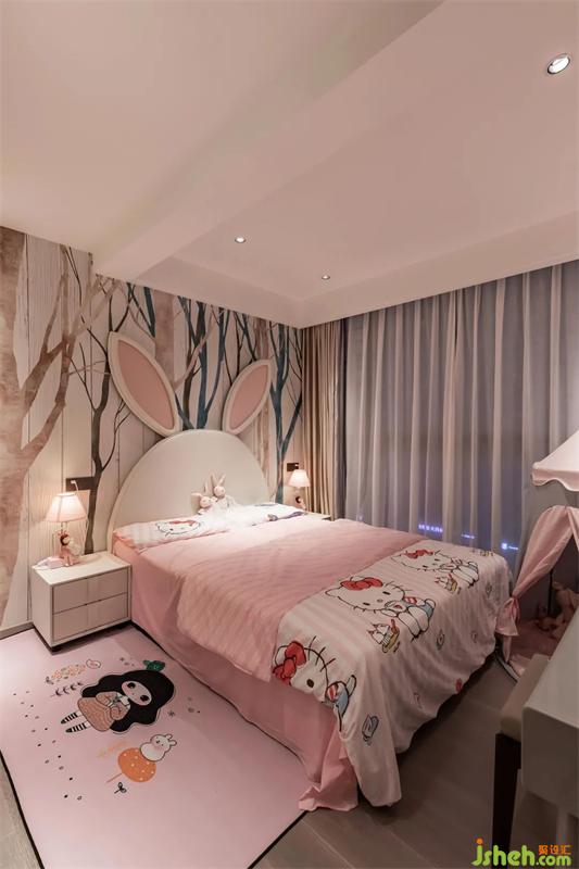 女孩房以森林主題為主基調(diào),床化成小兔子,融在床頭背景的粉色森林里,夢(mèng)幻而浪漫。
