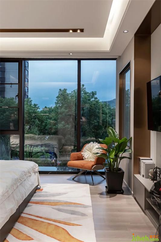 臥室的落地窗將大片美景擁入懷中,好比一副巨幅水墨,隨晝夜變幻。