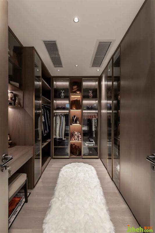 衣帽間通過各種柜體的排列組合,避免凌亂的產(chǎn)生。朦朧的玻璃移門、隱藏的燈帶,每一處細(xì)節(jié),均體現(xiàn)出精致的輕奢質(zhì)感。
