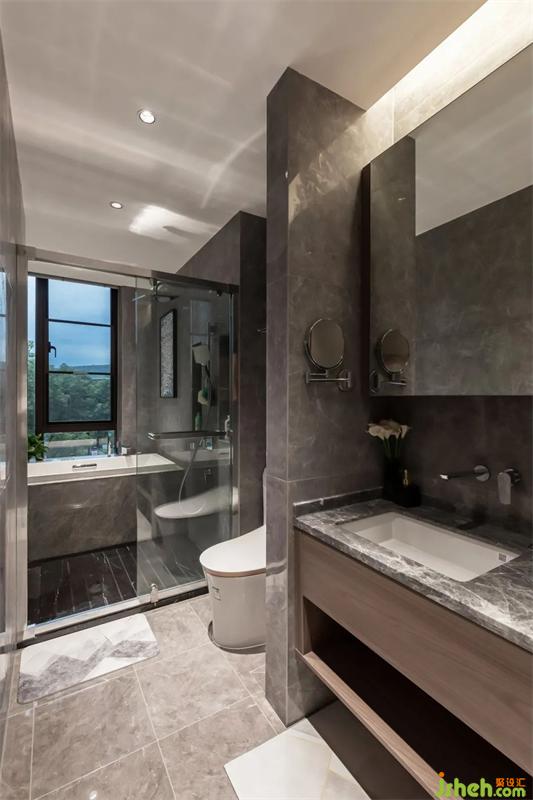 主衛(wèi)采用干濕分離的設(shè)計(jì),保證生活品質(zhì)。盥洗區(qū)上部的鏡柜除了方便檢查儀容,內(nèi)部也是相當(dāng)能裝。下部的木色抽屜滿足零碎物品的收納,不落地的設(shè)計(jì)更添輕盈。