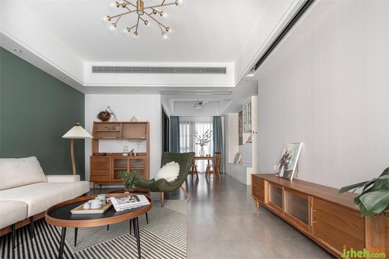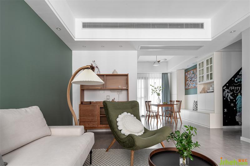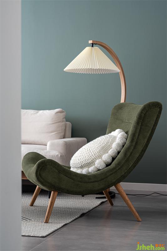 客廳舍棄了普通的電視選擇了時下流行的幕布,以白色、櫻桃木為主色調(diào),綠色的點綴使整個空間更具有層次感。墨綠色代表著一種性感的復古,溫柔而又充滿個性,仿佛被溫柔的包裹在春意中流動,讓人聯(lián)想起神秘的女人味。一片墨綠,就足以抓住欣賞者的心。