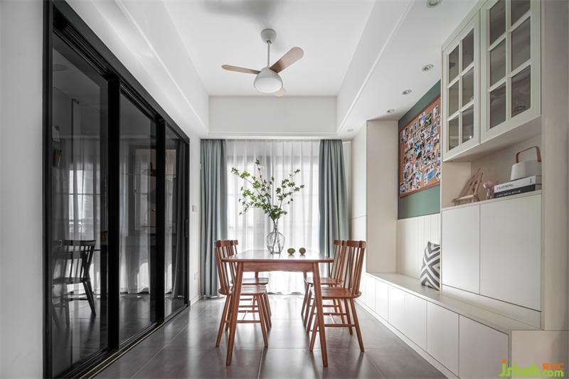 餐廳一字型卡座設計,卡座下面設計收納,既可以儲存物品使用,也能滿足業(yè)主平時的用餐需求,平時是業(yè)主3人用餐,有客人來也可以滿足5-6人的需求。溫潤的木質(zhì)長方形餐桌讓三餐更具溫馨氛圍。