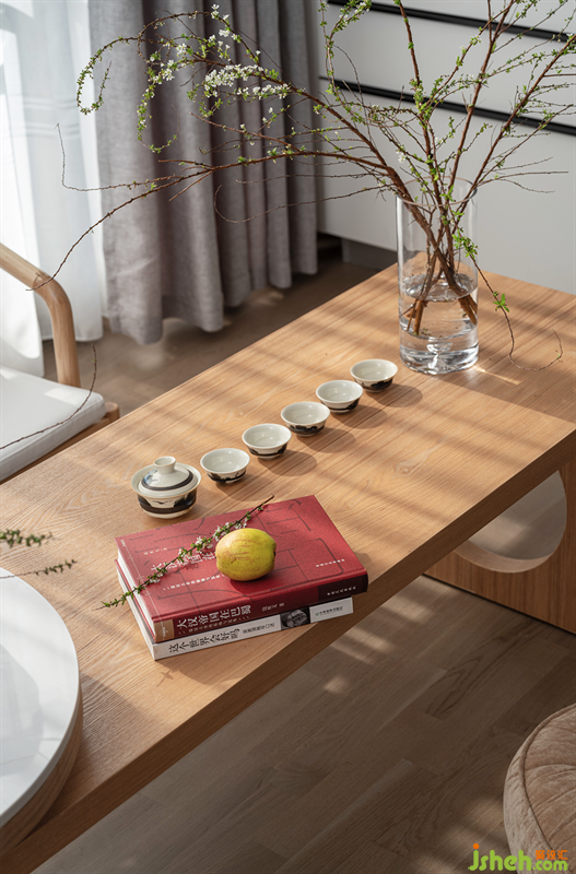 原木色的桌椅與同色系蒲團,客廳空間的會客功能并未被淡化,而是以返璞歸真的形式予以釋放。
