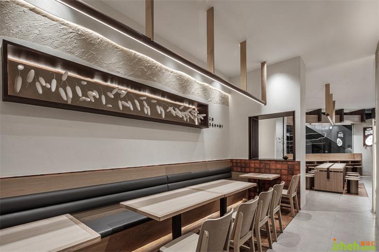流暢的動線與機能在通透開闊的尺度中動靜相宜,桌椅造型的轉換,為每一個區(qū)域注入了然的差異。面館設計靈動多樣的落座形式,恰如其分地鋪展開舒適愉悅的用餐氛圍,滿足多功能使用訴求的同時,銜接起人與人、人與空間的情感關聯(lián)。羅列有秩的米粒墻面造型不經(jīng)意間散發(fā)出戲劇化的品牌儀式感,打破了大面積純色所帶來的單調(diào)和寡淡,賦予空間疊加的層次感,蔥蘢的綠意妝點則為其注入勃勃生機,充滿詩情與畫意。