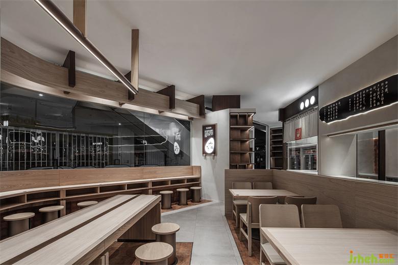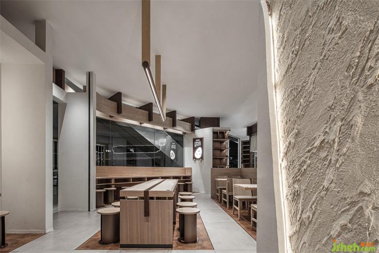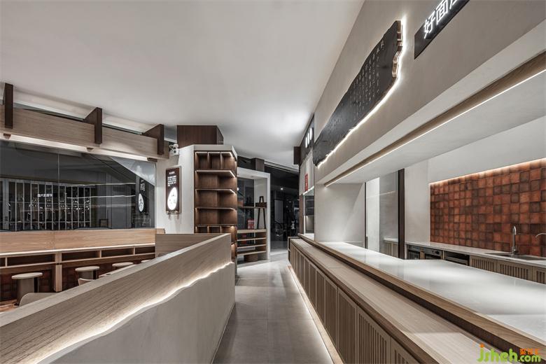 推門深入,室內(nèi)延續(xù)東方美學雅致澹然的筆觸,鮮明的品牌記憶,亦濃縮于其中。面館設計大范圍的木質(zhì)包裹,氤氳出溫潤質(zhì)樸的自然氣息,奠定了清新素雅的空間基調(diào)。紅磚白墻透過粗獷的紋理與質(zhì)感,實現(xiàn)復古與新生的平衡表達,以回應品牌一以貫之的歷史底蘊與文化內(nèi)涵。燈光與墻邊體塊、線條造型的交織,也讓整個空間萌生更加豐富的層次。