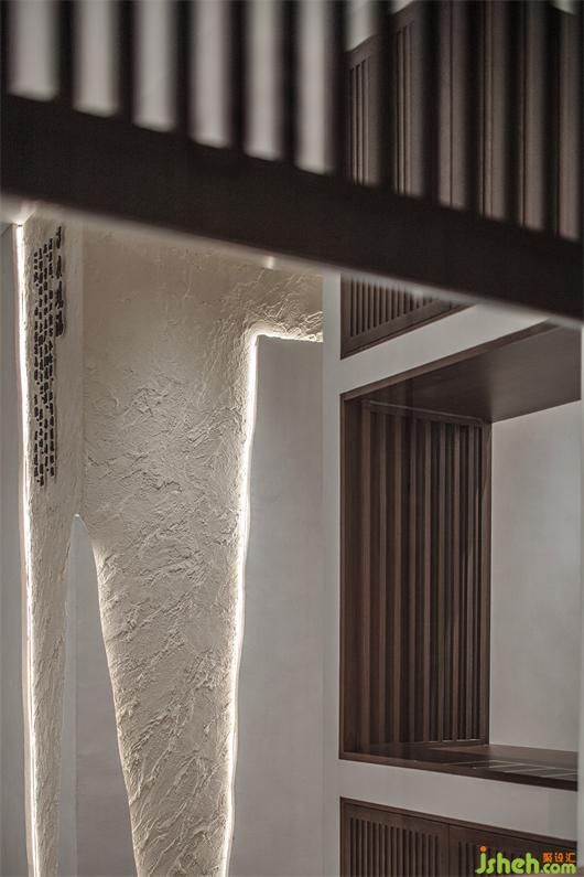 空間布局上,設計師摒棄了過多的隔斷區(qū)分,將餐廳內(nèi)部的墻體、混凝柱盡量保留,通過凝練唯美的建筑語匯悉心打磨,融入整體的設計之中??蚓暗慕缑鏄嬙焓侄?,豐富了光影在場景中的形制,意在借由視覺交互形成微妙的內(nèi)外關系,使獨立空間互通的同時,卻又保證了每個位置的隱私。