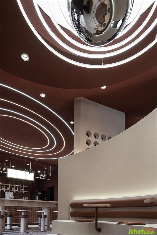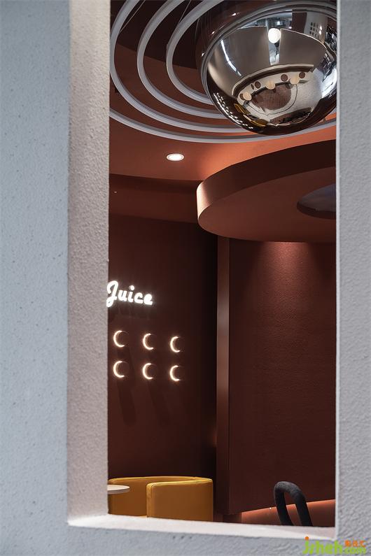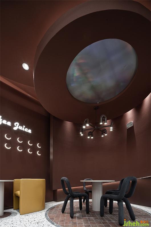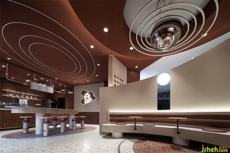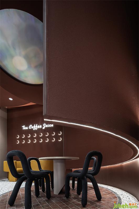 門頭造型呼應(yīng)飛船著陸的概念,奶茶店設(shè)計運用自然與物象的肌理,組合成新的趣味性視覺語言。外墻面刷成焦糖色,宛如高原上的“紅土壤”,有著來自原始的包容性。大小不一的球形燈散落在粗糲且質(zhì)樸的隕石壁上,營造出強烈的視覺沖擊感,引導(dǎo)來往的行人去探尋、發(fā)現(xiàn)和感知。