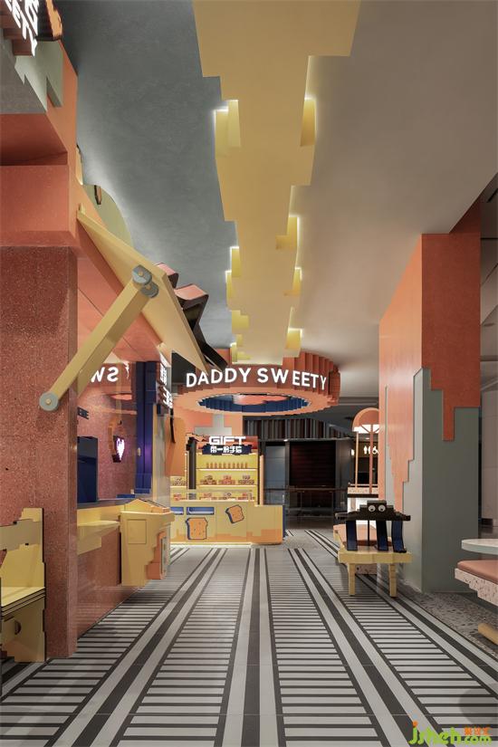 區(qū)別大面積純色背景,店鋪設(shè)計(jì)選擇豐富的色彩肌理延伸視覺(jué)效果,加強(qiáng)空間質(zhì)感??臻g以橘、黃、藍(lán)三色為基礎(chǔ)色調(diào),色彩鮮明,大膽新穎,皆可同時(shí)抓住成年人和孩童的目光。