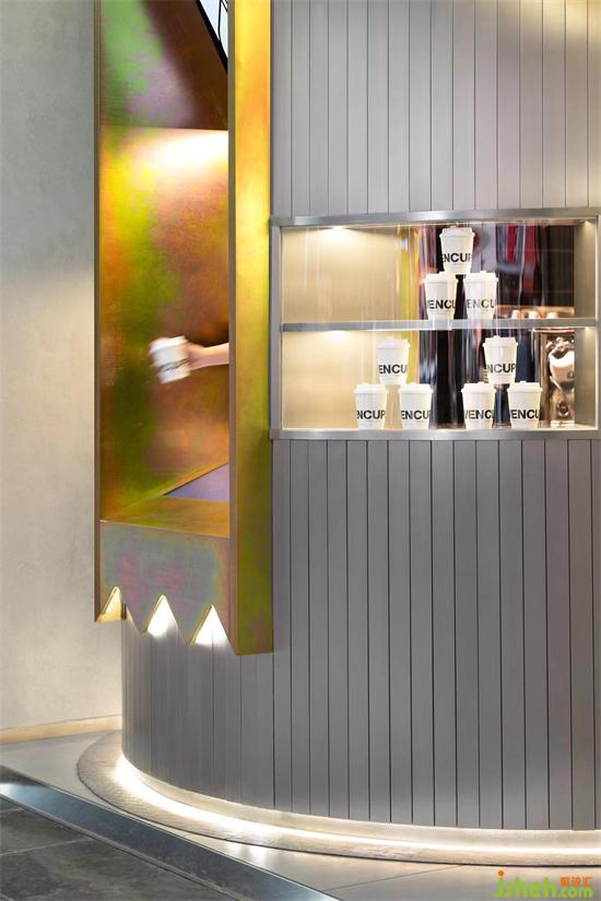 不銹鋼透露著簡(jiǎn)約利落,而彩色的嵌入則提升了整體色彩的豐富度。內(nèi)嵌式的點(diǎn)單場(chǎng)景使得點(diǎn)單操作更具有儀式感和私密感。透過(guò)兩側(cè)小尺寸玻璃視口,顧客能隱約看到操作區(qū)域,引導(dǎo)顧客能把更多關(guān)注放在品牌與享受產(chǎn)品本身上。店鋪設(shè)計(jì)隨視角變化色彩的箭頭符號(hào)始終貫穿全局,并以發(fā)光的形式將點(diǎn)單區(qū)、出杯區(qū)和自助區(qū)依次串聯(lián),讓點(diǎn)單、取杯、自助服務(wù)等一系列動(dòng)作過(guò)度銜接自然,不僅提升店面運(yùn)轉(zhuǎn)效率,也規(guī)避了因?yàn)楣δ軈^(qū)分不清晰而帶來(lái)的混亂和擁堵,保證顧客體驗(yàn)的流暢性,自助開放服務(wù)更傳遞了街頭外帶咖啡的松弛感。