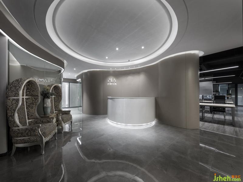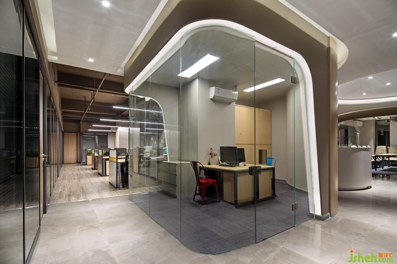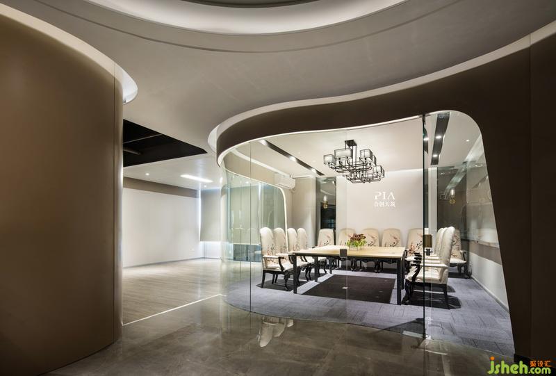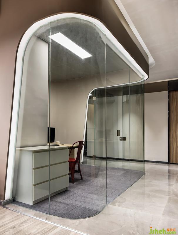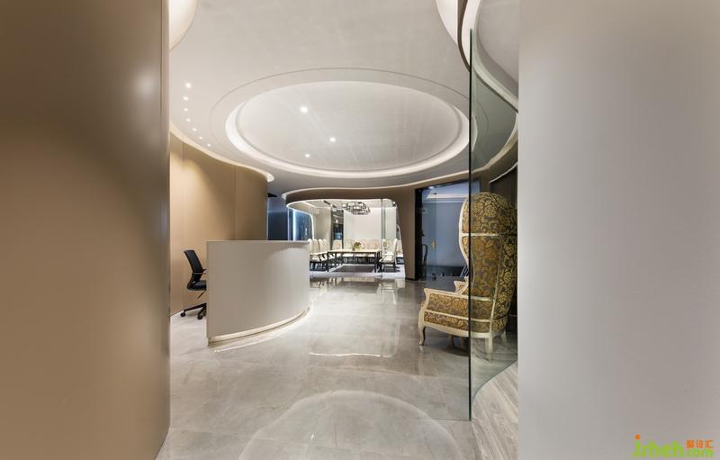 公司形像的設(shè)計以弧線條為動感元素貫穿整個空間,通過弧形燈光的變化引領(lǐng)空間的動感變換。材質(zhì)上室內(nèi)設(shè)計師運用灰色的石材表現(xiàn)地面,弧形的鋁板背景墻,白色的漆面玻璃突顯現(xiàn)代,時尚,國際化辦公空間。