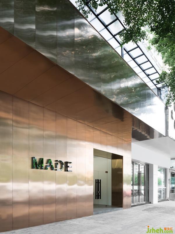 『MADE』,意為“制造、構(gòu)成”,為此我們在店鋪外立面的設(shè)計上,運用玫瑰金不銹鋼構(gòu)造出一體成型的金屬方塊,店鋪的主要入口不再是常規(guī)的居中,而是斜向30度切入,立體的方塊看似不經(jīng)意地被沖破,營造出獨特的構(gòu)造感。不銹鋼表面精致的拉絲質(zhì)感和鮮明的線條切割,與相鄰街景產(chǎn)生奇妙的對比,『MADE』顯得如此的神秘且瑰麗。