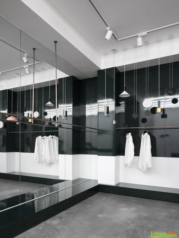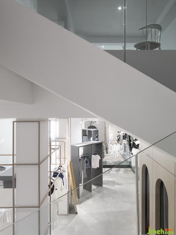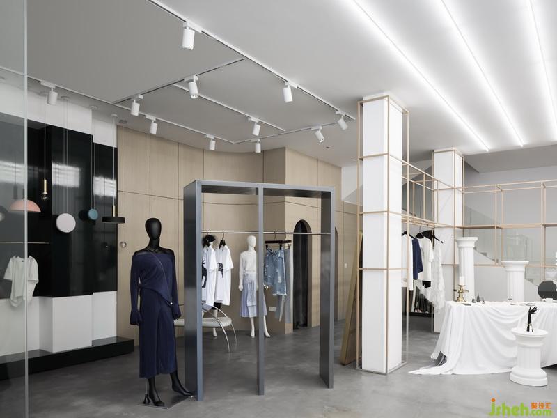 整個空間以白色和水泥色為基調(diào),造型不一的裝置融入當(dāng)中。被懸吊一側(cè)的不對稱桌子和不規(guī)則的金屬牌匾彰顯著個性;現(xiàn)代感十足的鐵制架子和充滿復(fù)古感的羅馬柱子,與那塊隨意落地的布幔和各式服裝配飾進行著有趣的對話;律動的吊燈與衣桿相互交錯著。木頭被分割和扭曲,色塊被分離和皺褶,個性而又靈動。