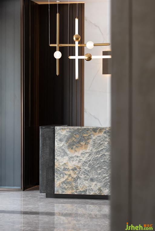 設(shè)計材料:橡木木飾面、水墨玉大理石、灰色大理石、藝術(shù)玻璃