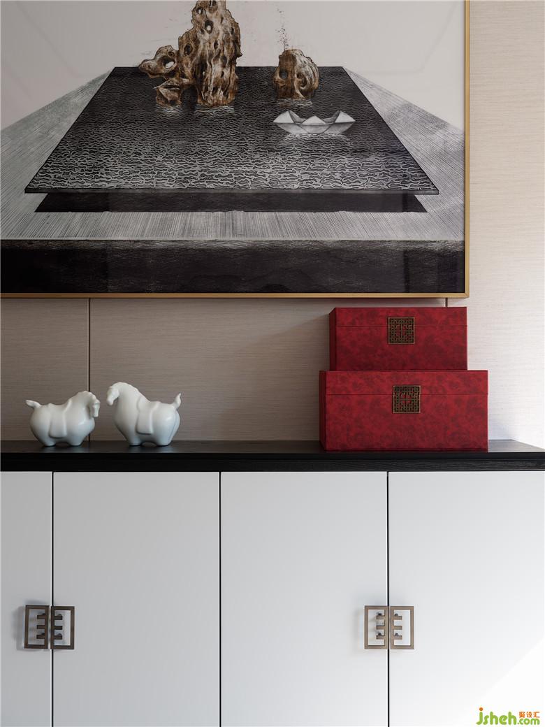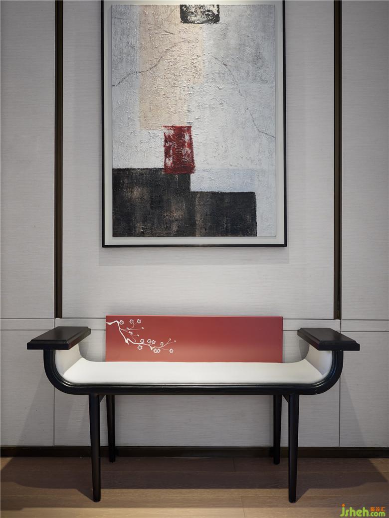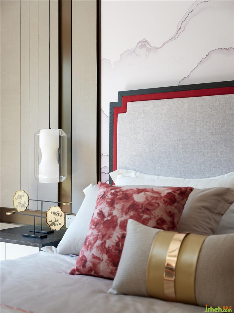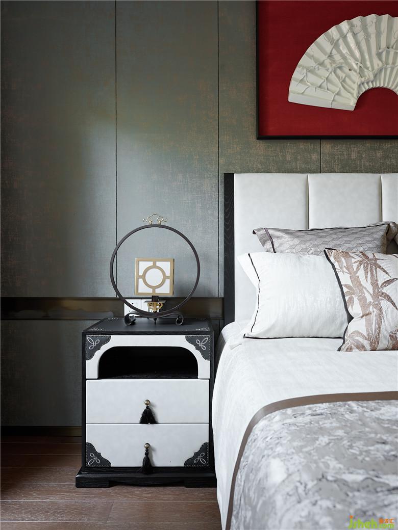 而臥室空間窗簾與床品顏色的互相輝映,突出詩(shī)意畫境。吊頂加以黑色線條過(guò)渡空間層次,山水背景畫的流動(dòng)之美,在繁花錦簇下虛實(shí)相應(yīng),無(wú)不從容淡然。