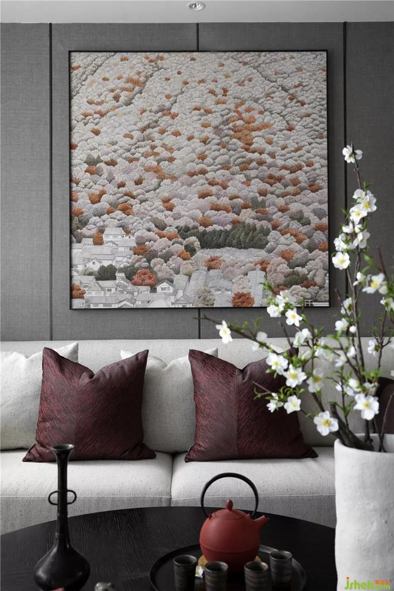 煙光嵐影,四時(shí)俱勝,客廳似一幅勝景畫(huà)卷,藝術(shù)的豐贍暢然入室。在方寸之間,藏置世間一卷煙火畫(huà)面。