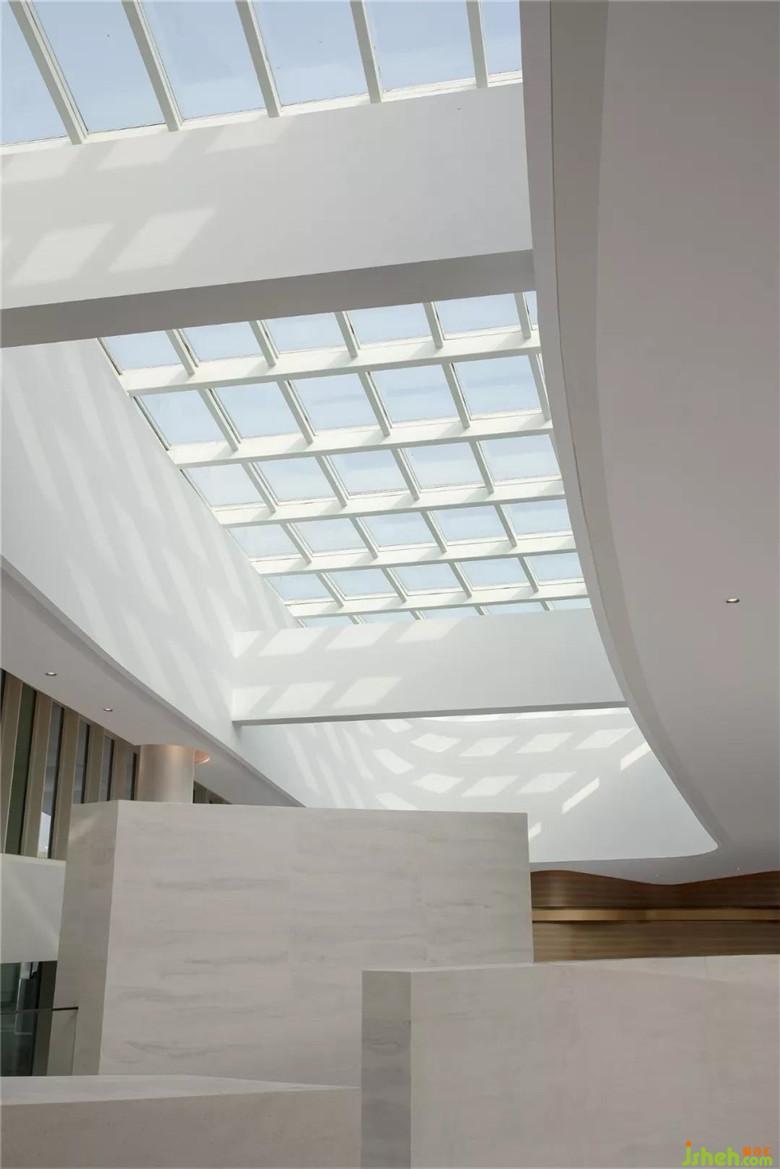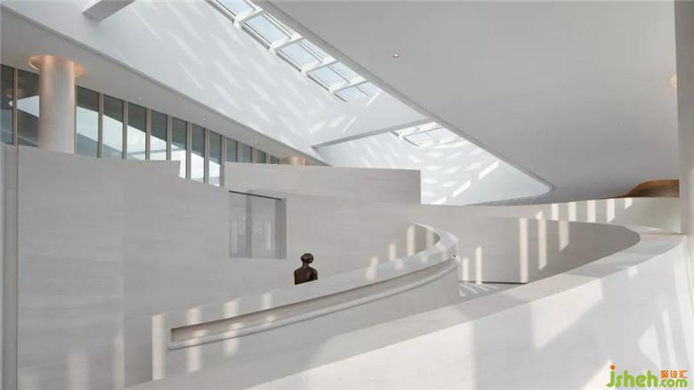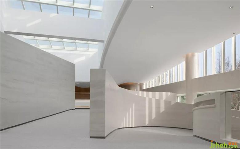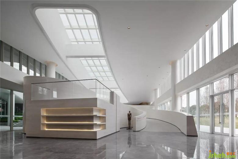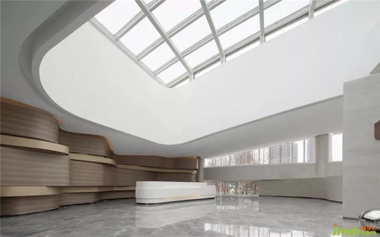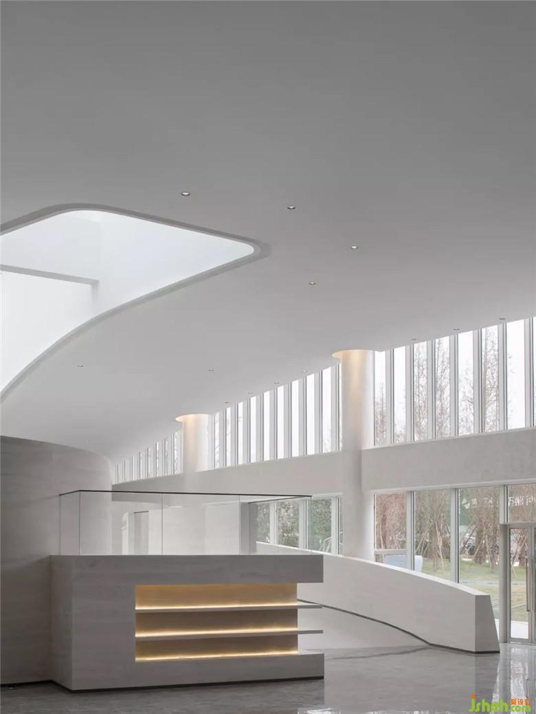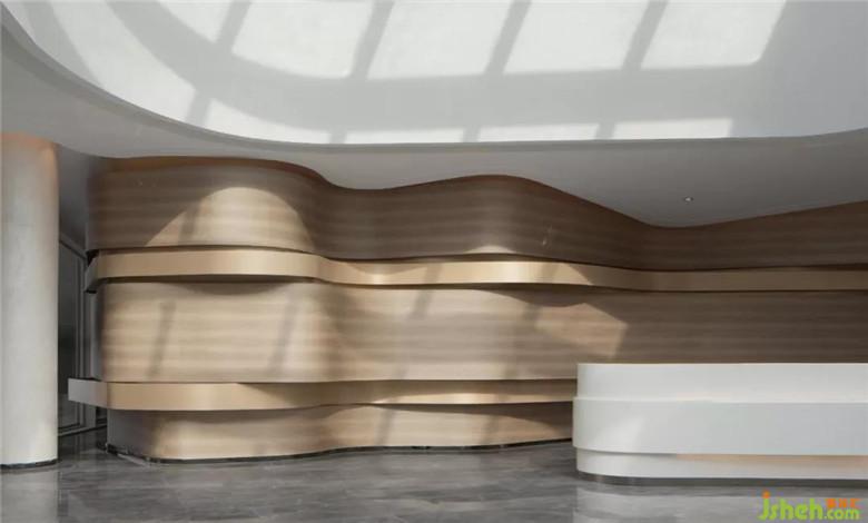 大廳疏朗高曠,迎面而來的純凈色彩,成就空間空且靈凈之感。接待臺背景以長江水波弧線層迭鋪灑于墻上,動線縈盈稠迭,空間不乏輕盈漂浮。