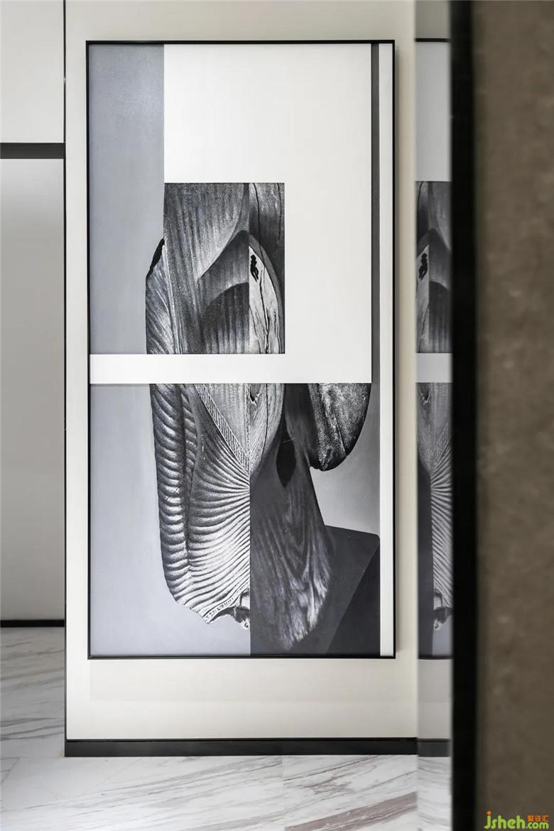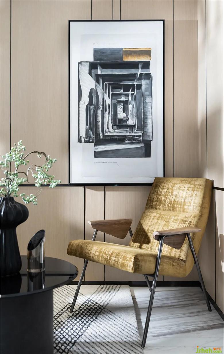 樣板房設(shè)計(jì)的光挑撥人細(xì)膩的情緒,細(xì)品微光中的柔情,能將繁雜沉淀,并與墻上的裝飾畫產(chǎn)生融合。皮革、大理石、金屬三者的搭配,相得益彰,凸顯高端優(yōu)雅與硬朗美。