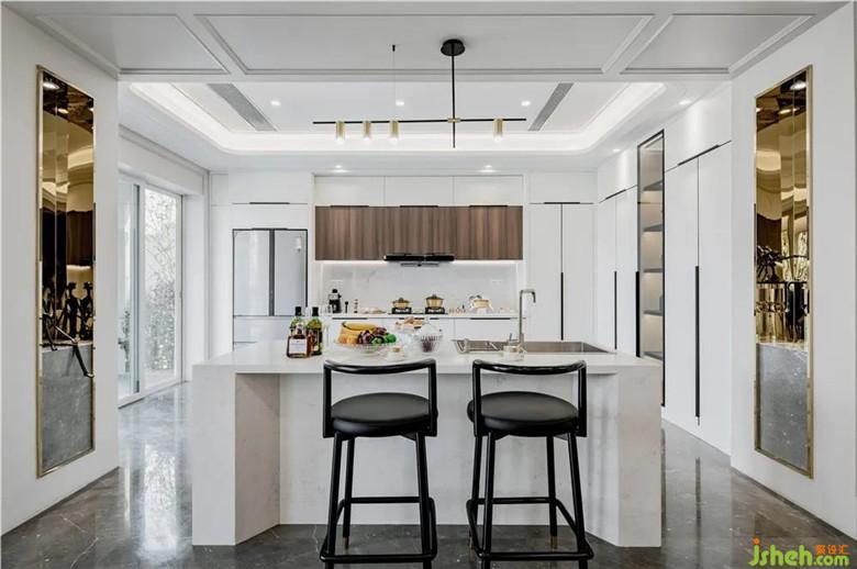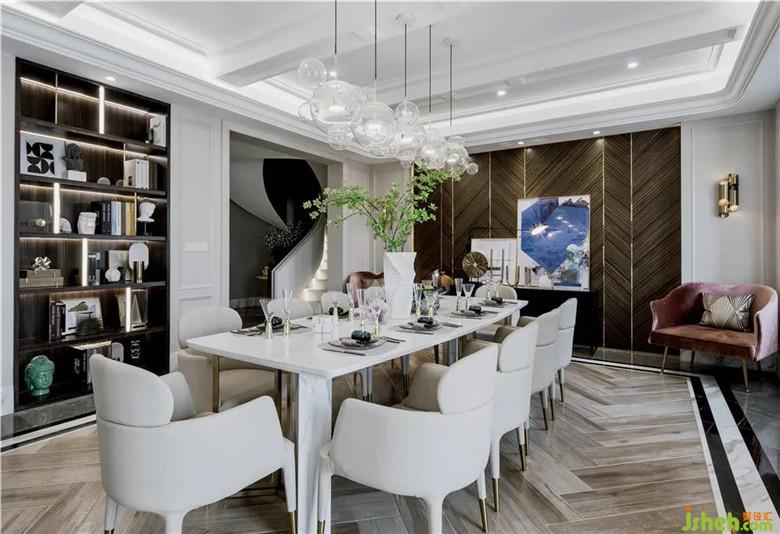 茶室在滿足冥想、品茗的同時(shí)也可作為接待、聚會(huì)的多重屬性。空間享有最好的采光面,高挑的結(jié)構(gòu)使空間更為寬敞、高貴,大理石圍合的壁爐形式刻印現(xiàn)代美式的柔和、溫暖感,頂面配以流性燈飾,落而不俗。