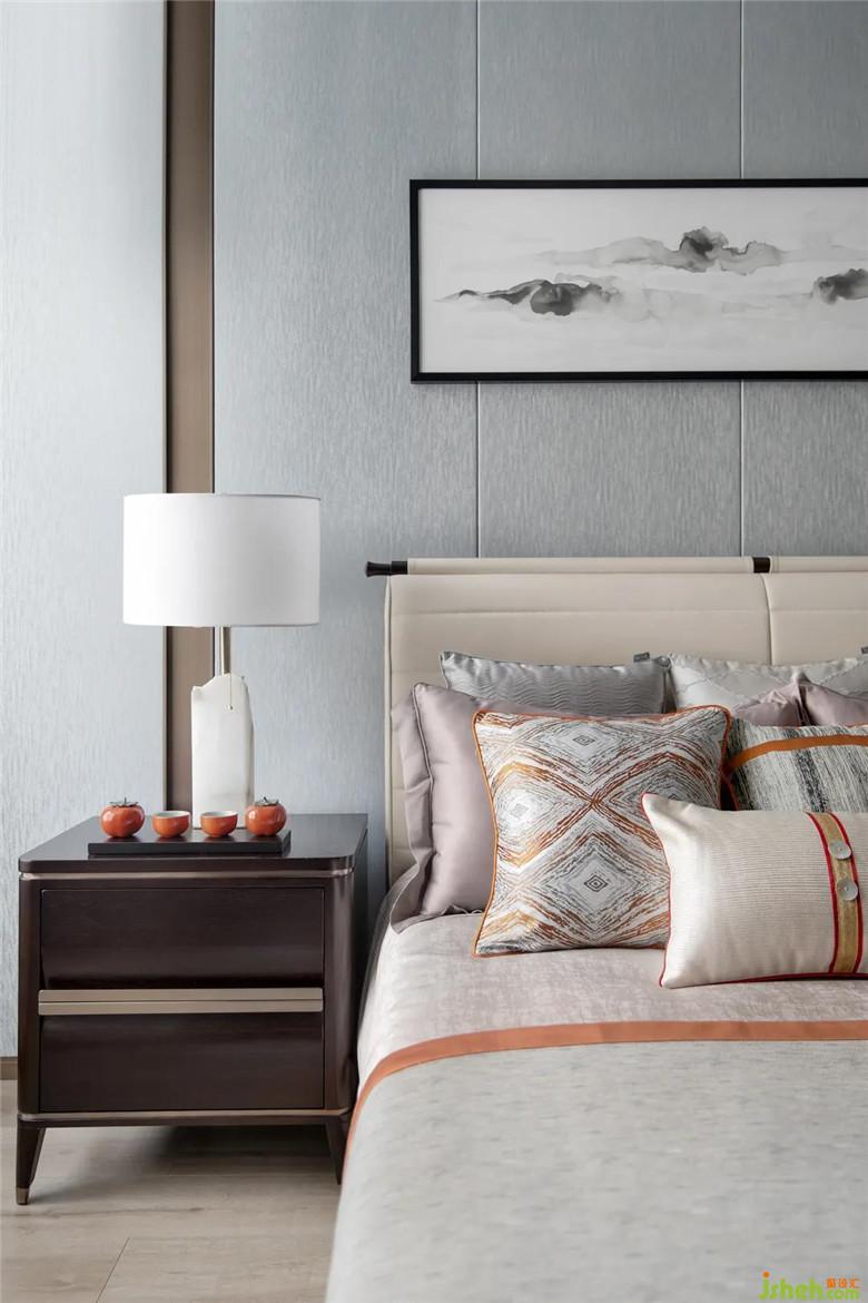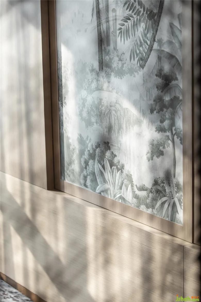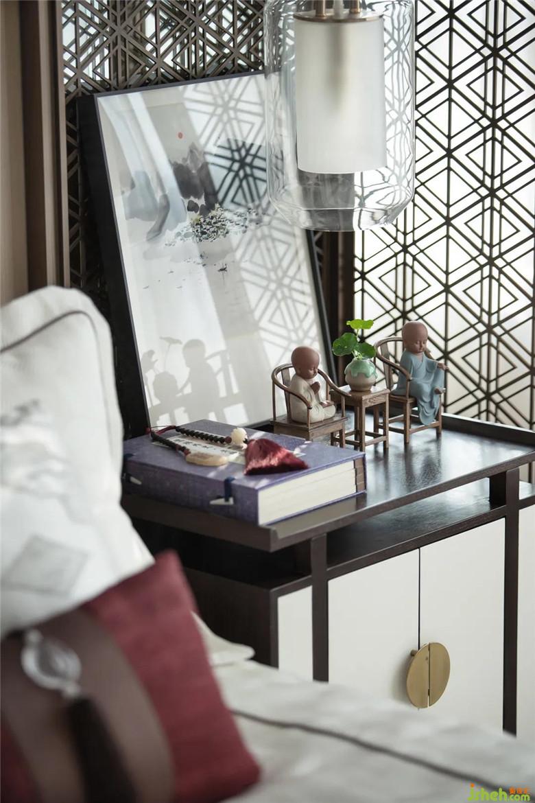 行至起居室,歲月刻于門窗欞飾上,座椅、瓷具、書卷等在形制上樣板房設(shè)計(jì)采用古雅今情的表達(dá),考量充分的美學(xué)性,細(xì)微的閑情逸趣被寫入床頭內(nèi),清雅山水畫卷后,實(shí)為移門屏風(fēng),推開(kāi)即書房,清雋別致間,渲染大隱于市的棲居生活