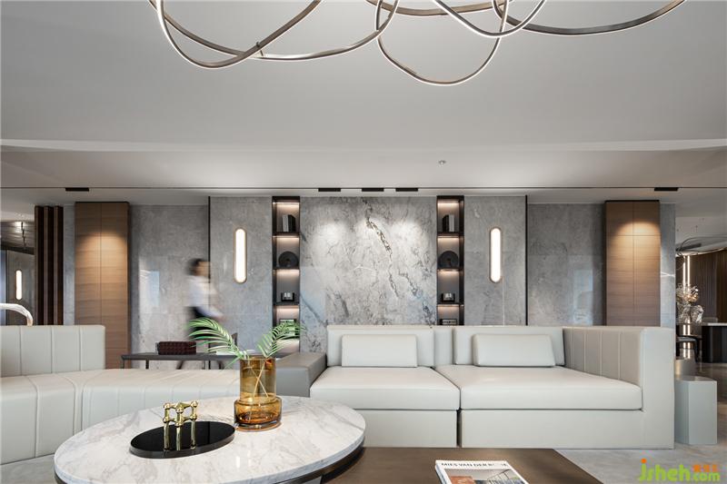 軟式搭配淺色調(diào)皮質(zhì)沙發(fā),塑造空間溫潤的基底,視角凝看天幕,曼妙的流性燈飾流露些許溫情,圍坐于次,從喧囂塵世中抽身片刻,感受靜謐,休憩身心。
