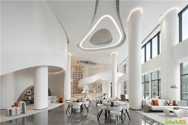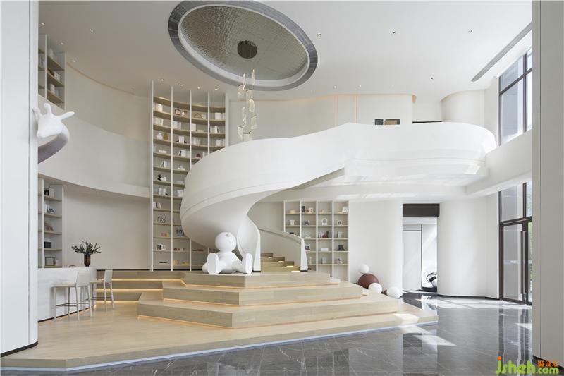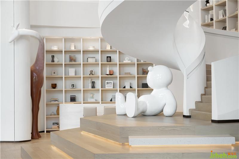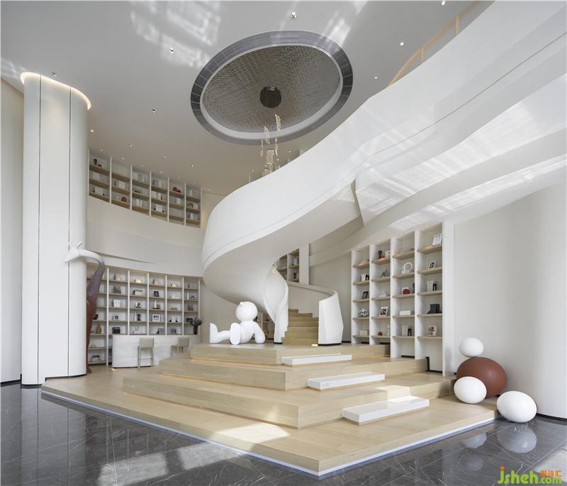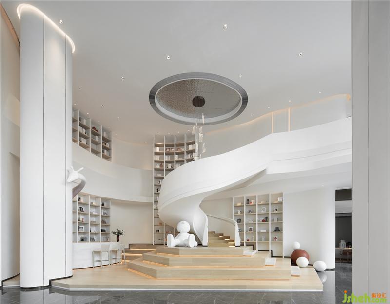 空間像是在白色的畫布上書寫一幅超現(xiàn)實(shí)主義畫面——流動(dòng)感、宏觀性、純凈力。前廳將線條與材質(zhì)之間的聯(lián)系收放自如,平鋪直敘間不乏微波傾瀉,減少繁瑣裝置的鋪敘,只余本色的充盈,這種空靈的美感思維似乎更能打開人內(nèi)心的禁錮,帶著直入人心緒的沖擊。