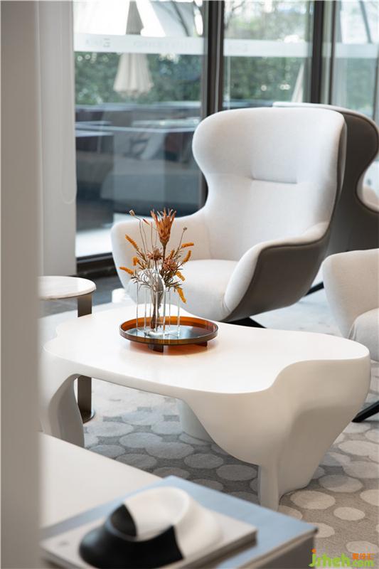 步入洽談區(qū),人們直面的是動(dòng)線明朗的休閑閱讀、洽談品茗區(qū)域?,F(xiàn)代簡約而精細(xì)的美學(xué)搭配,隨著立柱與弧線曲度流動(dòng),形成別具一格的交互體驗(yàn)空間,純凈色彩加以大面積挑空,架梁起繁華都市上的一隅清閑之地,濾盡浮華,內(nèi)心一派舒朗。