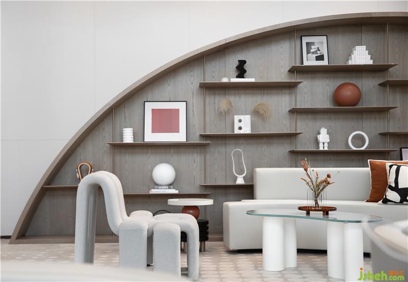空間好比精神容器,雖然商業(yè)依附在其中,但是情感的營造依舊是設(shè)計(jì)的第一位。在藝術(shù)裝置的甄選上,整體筆觸簡約而純粹,超高的書架依偎在墻邊,使空間變得散漫、輕盈,其下靜坐的小人與長頸鹿指向性得引導(dǎo)人們?cè)诖擞^賞書籍及藝術(shù)品,娓娓道來的是縈繞在心間的愉悅享受。